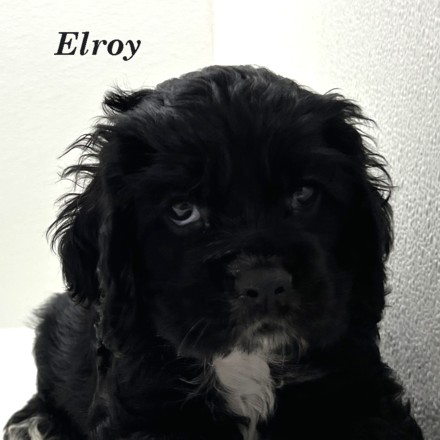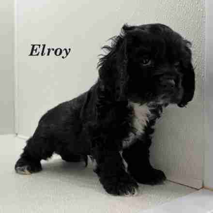 Elroy is a Black w/ White American Cocker boy. He is a shy little guy when it comes to new things, but once he gets to know you he is all about being a lover boy.